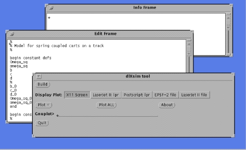 The main program panel (see Figure 1) contains a “Build” button, which when pressed causes processing of the system file. That is, the user system file is converted into a series of C code files by a parsing process. The files are compiled to a shared object file by gcc, and the contents of the resulting shared object module are dynamically linked into dlxsim as it runs. The linked code contains not just the system differential equations, but also modules for interactively manipulating parameters and plotting results on the basis of the variable names provided in the system file.