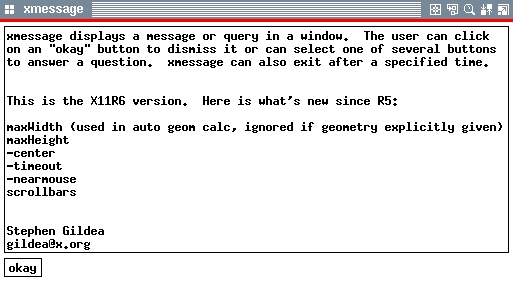 I first learned of xmessage's existence when Vivek Khera e-mailed me a shell-script that used xmessage, in conjunction with other Unix programs, as a message-of-the-day browser. xmessage, written by Stephen Glidea of the eX Consortium (2), is a generic tool that can be used to browse a text file or display a message. It consists of a widget in which the text is displayed and an “okay” button in the bottom left corner of the window. (See Figure 2.)
