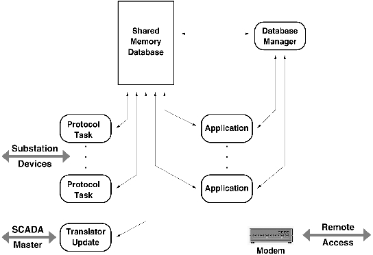 Another protocol task communicates with the translator device, which in turn communicates with the SCADA master computer. A database management daemon coordinates the activities of all these protocol tasks and also maintains shared memory partitions which contain the actual data. With all of these components taken into account, a typical substation controller setup looks like the one in Figure 3.