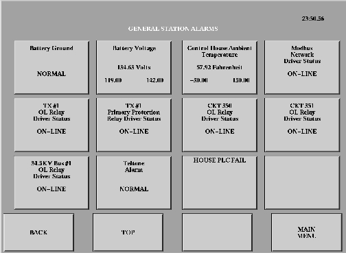 In most cases, the substation controller computer is rack-mounted along with the rest of the equipment in the substation “control house” (a small building intended mainly for protection from the elements). It has no keyboard and no monitor (try that with your Windows box). All system administration is performed remotely via dial-up login; database and program updates are distributed using UUCP. In some cases, the installation includes a touch-screen monitor to provide a local operator interface, consisting of an annunciator panel (see Figures 4 and 5) and even an interface for performing device controls (see Figure 6).