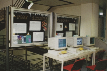 The machines and materials were on display without anyone from the workgroup watching or being there, other than during lunch time or coffee breaks. The whole idea was to have a display which invited people to sit down and explore the Linux systems.