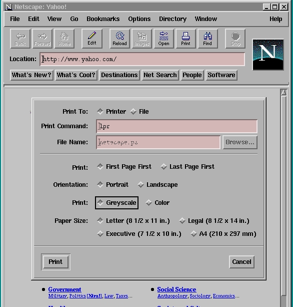 You should be able to print from Netscape without any tweaks at all. To test it, fire up Netscape and load a challenging document. From the File menu, select Print and observe the dialog that opens up. From the top of the dialog, verify that the “Printer” button is pushed, that your “Print Command” is lpr and that the rest of the print settings make sense for your printer and paper. Then, press the “Print” button. Figure 1 shows how this should look.