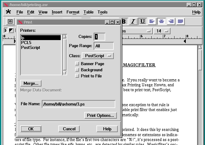 To print a project with Applixware, push the print icon on the top menu bar and note the print dialog that follows. Just press on lp under “Printers”, set “Class” to PostScript (should already be there), make sure the “Print to File” button is not pressed and click OK. With MagicFilter installed, Applixware should literally print right out of the box. Figure 2 shows how the print dialog appears just before printing.