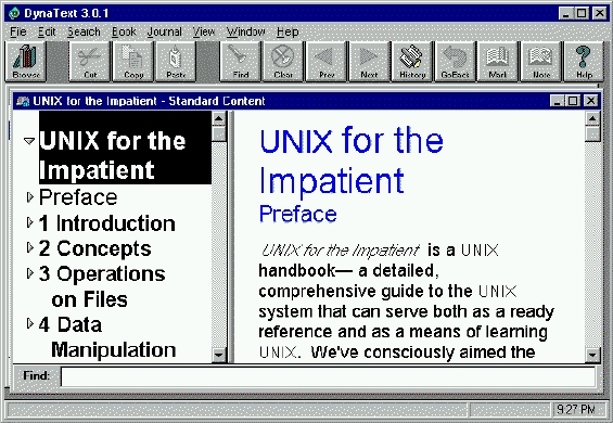 A product called DynaText displays the hypertext book and provides the user interface (see Figure 1, Reader Window). In addition to the expected read, browse, search and print functions, DynaText provides the user with the ability to define his own bookmarks, notes, and cross references. A journal feature allows the user to record and retrace his path through a series of topics.