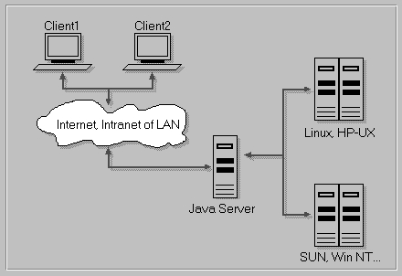 The demands for a multi-platform, secure tool brought us to a simple decision—Java. As we have a strong students' Java team at our lab, Java was chosen as the basic development tool. Java is a network-oriented, robust tool and provides enough security for our requirements. We won't go into details of the language, but it was also clear that Java was not appropriate for the system-level programming needed to access system resources. For that reason, we chose a three-tier architecture (see Figure 1). This architecture represents a response to some of the drawbacks of the standard two-tier client/server network architecture. Client/server applications are quite easy to program; the problem is how to manage client-side software. The problem is even bigger when we require a multi-platform environment. Three-tier architecture introduces so-called middleware (e.g., the Java server in Figure 1). Basically, the middle software residing on the server represents a bridge between a client and a server. The middle tier is not only capable of handling more client connections, but also provides a more secure method of communication. Since the middleware and the client part can be written in Java, we come to a very important issue—platform independence.