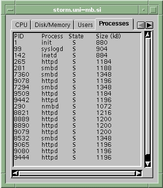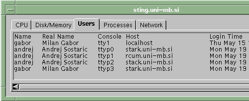 On the client side, one must run a starting applet to bring up the basic window in which all the computers to be monitored are listed (see Figure 2). Once we choose a computer's name from the list, a second window appears containing all the information about the observed system. We used a tabbed panel to display different types of data. We've chosen a tabbed panel to ease the upgrade procedure. If we add new system information, there is no problem with the graphical interface—we simply add a new panel.