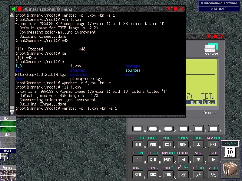 An included patched rxvt called xiterm allows pictures to be displayed in the background with Offix DnD compatibility (just like the Wharf). Select a file in xfm, drag it to xiterm, and its name will appear on the command line you're typing. It's lighter than xterm, supports color and will be more linked with AfterStep in version 1.3.2, becoming a standard part of its GUI, like title bars, Wharf and Pager. Configure-time options are made via menuconfig (just like the Linux kernel); this will also be true for future versions of AfterStep.