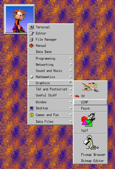 Menu Main;Applications;apps.xbm Program Terminal;xterm.xbm;xterm Program Editor;edit.xmb;nedit Separator Text Groups SubMenu Graphics End Menu Graphics;Graphics;graph.xbm Text Image Program GIMP;gimp.xbm;gimp Program Paint;paint.xbm;paint Separator Text Draw Program tgif;tgif.xbm;tgif End