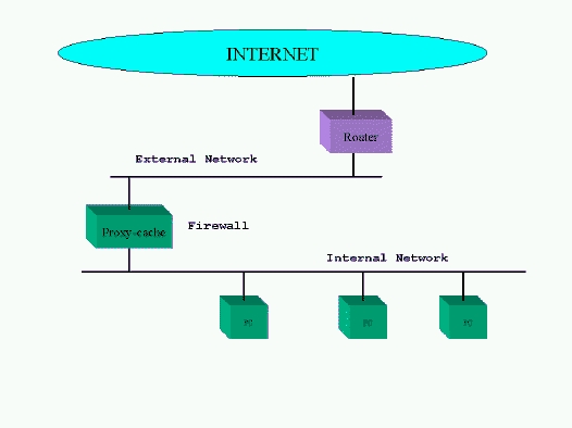 A proxy-cache is not just a solution to the bandwidth crisis; it is also desirable when a network firewall is needed to guarantee the security of your organization. In this case, the proxy-cache sits on a computer accessible from all local browsers, but isolates them from the Internet at the same time. This computer must have two network interfaces attached to the internal and external networks and must be the only computer reachable from the Internet. Figure 2 illustrates such a configuration. The proxy-cache server must be accessible only by internal systems to ensure that no one on the Internet can access your internal documents by requesting them from the proxy-cache. I will discuss access control to the proxy-cache later in this article.
