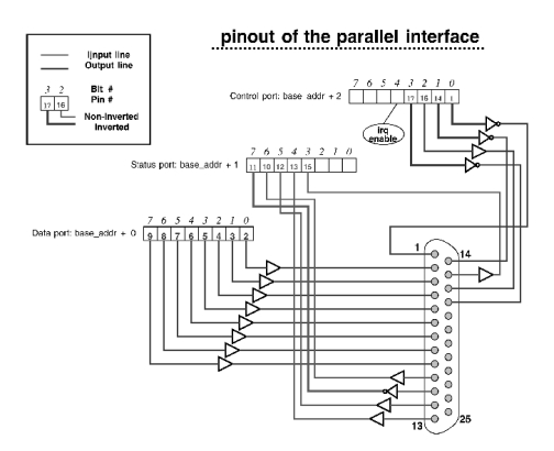 The parallel port is a simple device; its external connector exposes 12 output bits and 5 input bits. Software has direct access to the bits by means of three 8-bit ports: two ports for writing and one for reading. Moreover, one of the input signals can trigger an interrupt; this ability is enabled by setting a bit in one of the output ports. Figure 1 shows how the three ports are mapped to the 25-pin connector. The base_addr of a parallel port (the address of its data port) is usually 0x378, 0x278 or 0x3bc. The vast majority of the parallel ports uses 0x378.