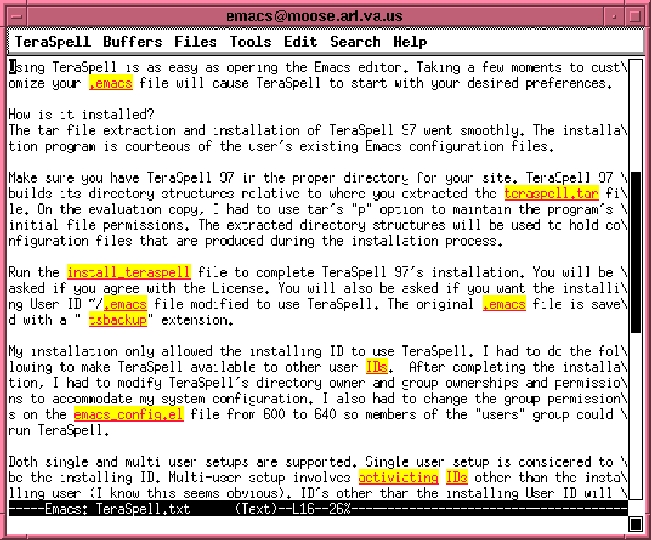 TeraSpell 97 for Emacs is a shareware version of the Teragram Corporation's Teragram Spell 97 for Windows, Mac and Unix. Naturally there are some differences between the shareware and the full product. TeraSpell for Emacs provides the Emacs user with a flexible multi-language tool for spell checking documents. As a test, I decided to use TeraSpell 97 and Emacs to write this review.