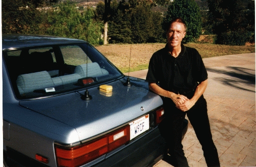 Figure 2 shows an example of a tracker. Here, an ordinary automobile is shown with some not-so-ordinary equipment attached to the trunk. The object of interest, located in the center of the trunk, is a GPS satellite antenna. Also shown is a vertical whip antenna, used to broadcast APRS packets from a transmitter located within the vehicle. A second vertical whip antenna is used for voice communication. Pay no attention to the man behind the curtain (i.e., leaning on the car).
