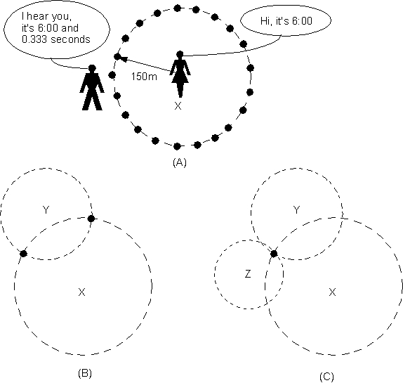 For example, assume you and your friend both have accurate synchronized clocks. At some unknown distance from you, she yells, “It is now 6:00 and 0.000 seconds.” When you hear her, your clock shows the time as 6:00 and 0.333 seconds. You can now compute your distance from her as 100 meters by multiplying the speed of sound (300 meters per second) by the elapsed time (0.333 seconds). With this single test point, you are able to compute your distance from the source. Specifically, you are located in any direction 100 meters from your friend. This scenario is shown in Figure 4A by the multiple dots located on the circumference of the circle.