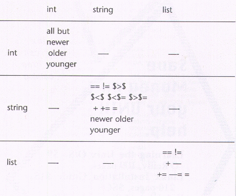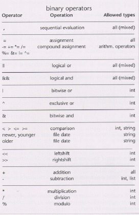 Icmake allows a large number of operators to form or combine expressions. Binary operators may be used with the following operand-types: