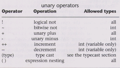 The unary operators are summarized in the following table. The unary operators have higher priority than binary operators and are right-associative. The exception is the expression-nesting operator, which surrounds an expression and does not associate.
