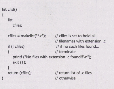 A list or variable yields not zero when the number of strings in the list is not zero, e.g., in the following code fragment the making process is stopped when no files with extension “.c” are found: