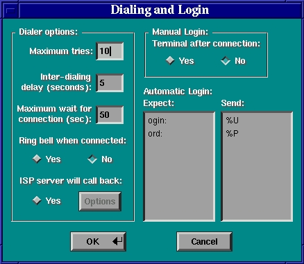 The next item, “Dialing and Login”, has you set the login and connect environment. Set the number of retries, connect notification, ISP callback and login setting. For manual login, X-ISP will start xispterm, or if you know the sequence, you can put together an automated login script and send user name, password and any initialization commands to the remote host. (See Figure 3.) X-ISP will use the connection script for automatic login or ISP call-back. For PAP or PAP/CHAP-Secrets authentication, the script will be ignored.