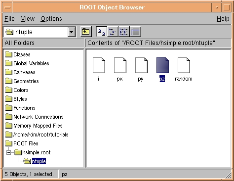 will fill a histogram containing the distribution of the px values for all tuples for which pz < 1. Substitute for the abstract quantities used in this example quantities such as name, sex, age, length, etc., and you can easily understand that Ntuples can be used in many different ways. An Ntuple of 25,000 tuples is quite small. In typical physics analysis situations, Ntuples can contain many millions of tuples. Besides the simple Ntuple, the ROOT system also provides a Tree. A Tree is an Ntuple generalized to complete objects. That is, instead of sets of tuples, a Tree can store sets of objects. The object attributes can be analyzed in the same way as the tuple quantities. For more information on Trees, see the ROOT HOWTOs at http://root.cern.ch/root/Howto.html.