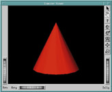 Clicking the top button on the right of the main window changes the mouse to selection mode. Moving the cursor to any intersection of the double rings and selecting it with mouse button one causes it to be highlighted in yellow, allowing us to rotate the cone about its axis. If the mouse is still moving when released, it will continue spinning. Clicking on the hand icon will revert to viewpoint manipulation mode, so that both the cone and its manipulator can be rotated about the viewpoint axis. The cone is now spinning on its own axis and orbiting around the center of the scene.
