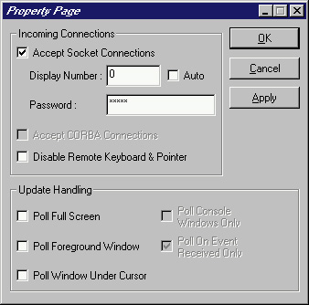 • In the Update Handling section, various options can be turned on/off to control how the VNC server sends “desktop changes” to a VNC viewer. See http://www.orl.co.uk/vnc/winvnc.html for in-depth explanations on the pros and cons of each option.