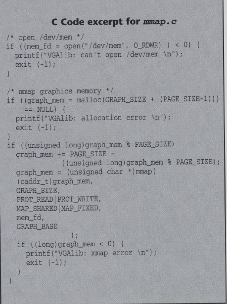 Other devices may need to be accessed at some place in physical memory. The first 3GB of physical memory (if you have more memory than that and don't know how to access the 4th gigabyte, you don't have my sympathy...) can be accessed through /dev/mem. The sidebar (at left on page 20) gives a rough version of the mmap() code from svgalib, which, like XFree86, is a user-space device driver for video cards: