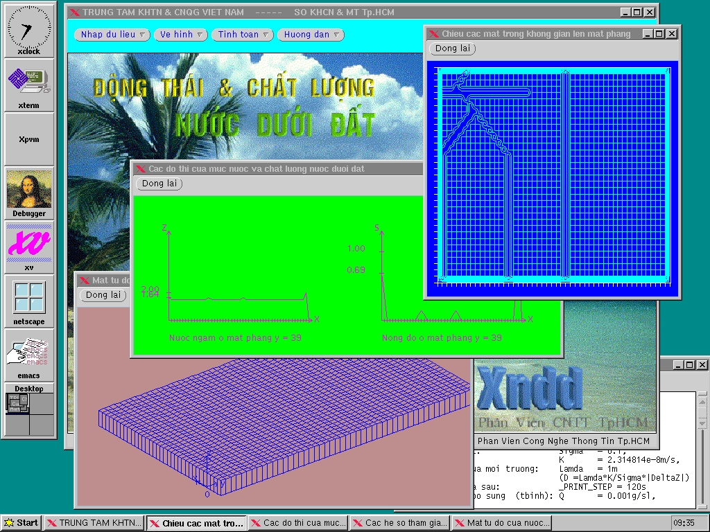 We designed and built the X Window System program Xndd under Linux. This program can be used for simulating the surface of underground water and the transfer and diffusion of pollution. The interface of the program and some calculation results are shown in Figure 3.