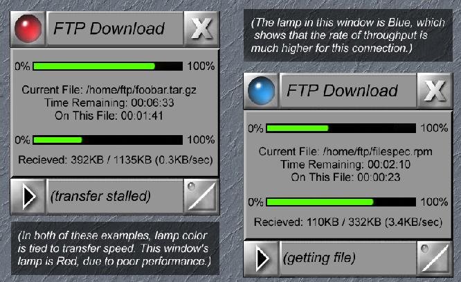 Suppose one of the above-mentioned FTP transfers begins to stall. One of the beacons begins to glow red and stays red for several minutes. Simply pop the window back open, kill or restart the transfer. The instant you kill that process, the other four beacons begin to glow more brightly, since you have just improved the speed of the other four by freeing up some bandwidth.