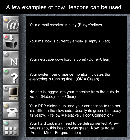 Beacons make the task of babysitting multiple applications a breeze. An entire 3-D rendering package could be collapsed down to a single beacon—one that will turn green when the rendering of a scene was complete, for example. There is no longer any need to continually pop the application back open to see what is going on.