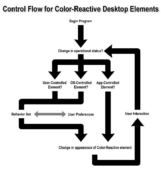 Since the behavior of color-reactive elements should be consistent throughout the desktop, a centralized point of control is needed (in the form of a control panel, for example) to allow the user top-level control. From there, it would also be wise to allow the applications, if permitted by the user, to dictate their own behavior sets. Ultimately, the user must have total and complete freedom to dictate the appearance and behavior of color-reactive elements on his or her desktop.