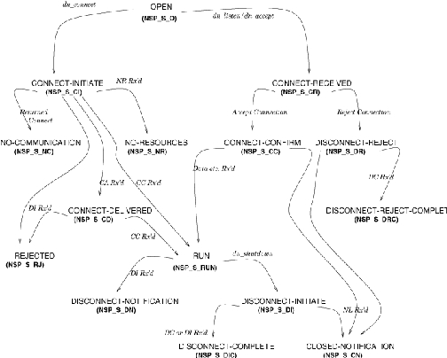 The rest of the NSP layer is divided into two parts: one for dealing with outbound packets, dn_nsp_out.c, and one for incoming packets, dn_nsp_in.c. The state table for the NSP layer is shown in Figure 2. We won't say much about the diagram here, but it should be a useful aid when used in conjunction with the kernel code.