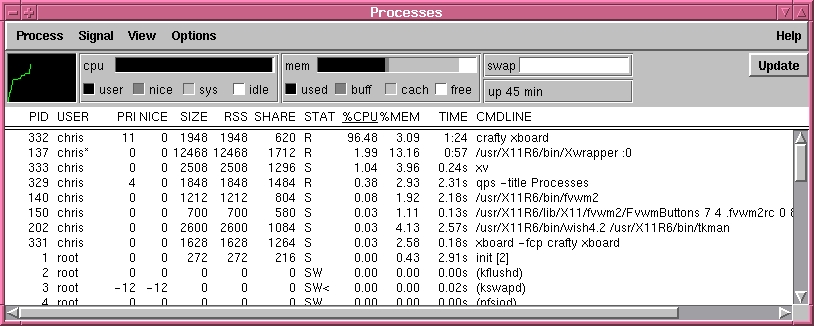 qps by Matthias Engdegard is a graphical incarnation of ps, top and kill and is based on the Qt toolkit. qps is an attractive and powerful tool. You can use it as an advanced version of top by selecting “All Processes” from the “View” menu, specifying the “Update Period” in the “Options” menu and clicking on “CPU” in the header line of the process list to make qps sort the list by the used CPU time. This will reveal which processes are eating the processor time on your system (see Figure 2). Or you can use qps as a combination of ps and kill by selecting a process from the process list and sending a signal from the “Signal” menu.