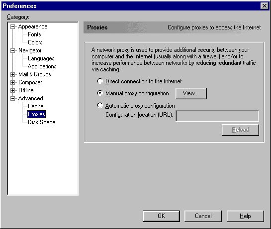 In Netscape Navigator or Communicator, you can include a proxy server and its port for each service to be proxied. With Squid, you can use these settings for the HTTP, Security (SSL), FTP and WAIS services, all with the same port (3128, by default). First, select the “Manual proxy configuration” radio button and then the “View” button to type in your settings. Figures 1 and 2 show examples of these screens.