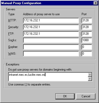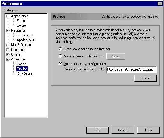An example of this kind of configuration for Netscape Navigator and Communicator is shown in Figure 3. In this example, each time the browser is started, it loads the file proxy.pac from the server intranet.mec.es. This file must be returned with MIME-Type application/x-ns-proxy-autoconfig which can be accomplished in two ways: