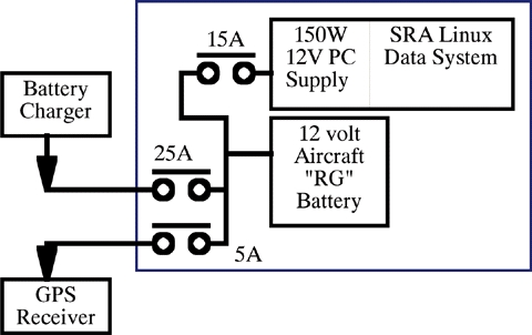 Figure 4 is a block diagram of the SRA power system. The SRA requires an uninterruptible power source for Linux and the three differential GPS receivers and computers. Instead of an off-the-shelf UPS, we went with a 12-volt 25 AH “RG” (recombinant-gas) sealed aircraft battery as the prime power source for the system. This was chosen for two reasons:
