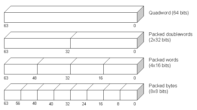 The MMX technology extends the Intel architecture by adding eight 64-bit registers and 57 instructions. The new registers are named MM0 to MM7 (see Figure 1). Depending on which instructions we use, each register may be interpreted as one 64-bit quadword, two packed 32-bit double words, four packed 16-bit words, or eight packed 8-bit bytes (see Figure 2).