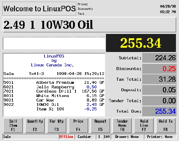 Being a Linux consultant by night and a Windows programmer by day, I am always looking for the best way to solve different problems. Recently, I was given the chance to apply a Linux solution in a new market for us. A longtime Linux client asked me what I'd recommend for a point-of-sale system. Of course, I knew if he was asking me, he probably wanted a reliable solution based on Linux. After a little searching on the Web, I found LinuxPOS from Linux Canada, Inc. Their web site said LinuxPOS was still in beta but a demo copy was available, so I downloaded it. The beta installed easily and in a few minutes I saw the POS login screen. I was impressed immediately.