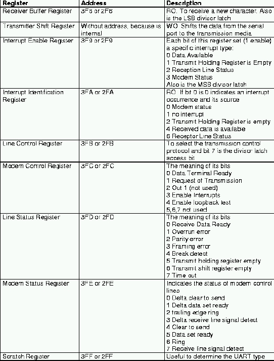 Each I/O port has a range of addresses to hold various support registers. COM1 is mapped in memory from 0x3F8 to 0x3FF, and COM2 from 0x2F8 to 0x2FF. See Table 1 for a description of some of them. To set one bit in any register, first read the actual value, and then OR with the desired value, thus preserving the other bit values.