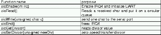 The functions we will implement will be the basic ones needed to control the serial port using interrupts on character reception. The serial ports can't be accessed by a common user. In Linux, the functions inb(port) and outb(byte, port) exist to receive and send one byte; inw and outw do the same on two-byte data. In order to use them, you have to gain the rights by using the iopl or ioperm functions, which must be invoked as super user and will give the common user application access to the I/O ports.