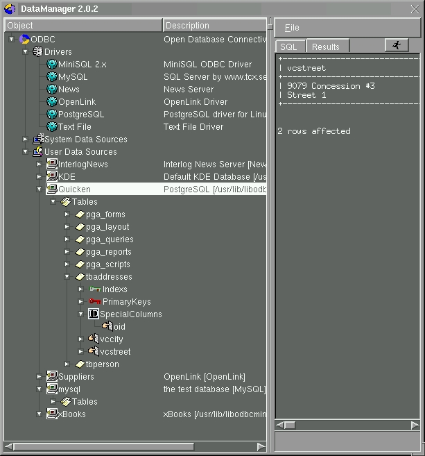 Now run ODBCConfig to add, edit or remove data sources. You will need to be root to work with system data sources, but any user can add, edit and remove user data sources. Now run the DataManager, and you should see all ODBC data sources. When you try to expand the TreeView below a data source, you will be prompted for login information to connect to the data source. You can also try to connect to your data source using the isql command-line tool. Simply execute the command: