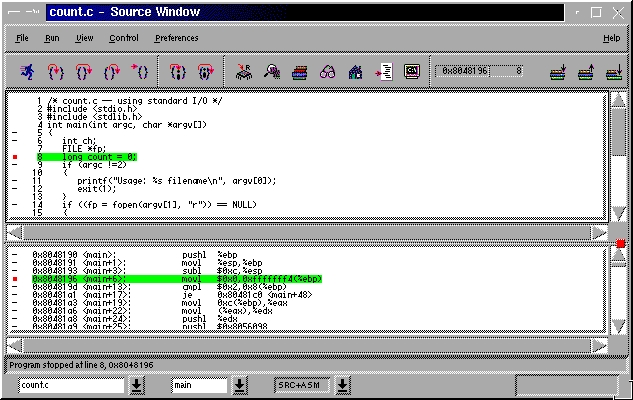 For me, GNUPro's visual debugger makes debugging easier. I like being able to see graphically what is happening. Figure 1 contains a KDE environment screen capture of the debugger's Source Window.