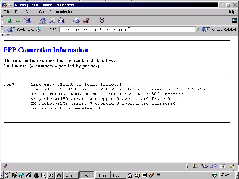In the last example, I talked about the beleaguered administrator (is there any other kind?) and suggested this might be a useful tool for them as well. What if you are administering that system from far away? Worse yet, this Internet gateway runs on a budget—it's a simple dial-up connection to an ISP running diald and IP masquerading. When trouble strikes, they call you. Trouble means you use TELNET to log in, check things out and fix the problems remotely. Trouble is, the IP is dynamic and changes with each connection to the ISP. The solution this time is the showppp.pl script shown in Listing 2. The script is simple and lives in cgi-bin. Depending on your web server setup, you might want to rename this one showppp.pl.