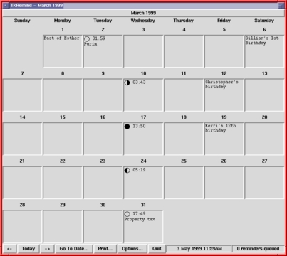 The TkRemind front end runs Remind in a special “daemon mode” so that timed reminders like the previous example are popped up in X windows.