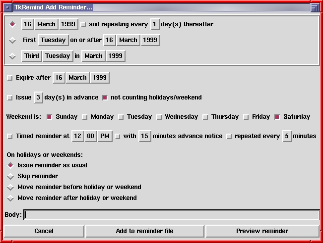 With TkRemind, you never have to learn Remind's scripting language, as long as you can express all the reminders you need with the GUI. However, you are encouraged to learn to script Remind; from the GUI, just click “Preview Reminder” to see the Remind code which will implement your reminder.