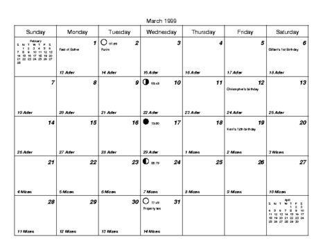 Ultimately, all calendars are derived from astronomical observations. Remind includes routines to calculate sunrise and sunset times for where you live, as well as moon phases. The moon phases were illustrated in the GUI calendar. These astronomical calculations are available as built-in Remind functions.