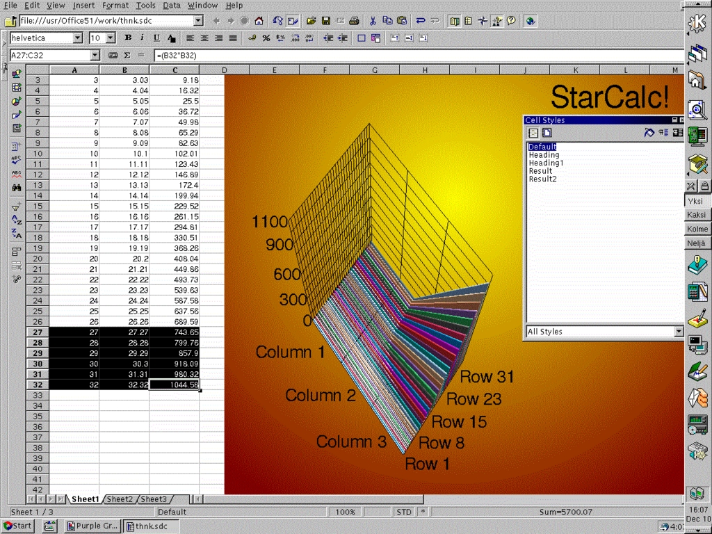 The graphics on both spreadsheet packages are fine. The computer will generate color graphs of your data, rotate it, label it, and let you decide all the details of how it will look. This is typical of spreadsheets, but these actually do a good job of it. StarCalc is more thorough and offers some nice 3-D functions. Applixware is a bit funny; it uses chi as the formula icon, but then doesn't have chi stat formulas.