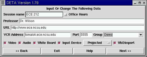 The MBone tools were not specifically designed with distance education in mind. In fact, though interoperability and uniformity between the applications was a goal of the original designers, it had yet to be achieved when the first MBone classes began at NC State. Additionally, the tools themselves have a relatively steep learning curve for nontechnical users. For example, in order to create a new session, a number of technical options have to be set in sdr, including Type of Session, Session Scope, Type of Media and Session Time. Experienced users have little difficulty navigating these options, but to meet the needs of distance education, users have to be able to operate the tools with only minimal training. In order to accomplish this goal, the distance education Teaching Assistant was created. DETA is a wizard-style interface to the MBone tools. It hides all of the technical options the inexperienced user should not have to deal with. Originally, it primarily functioned as a simplified interface for starting Mbone-based Distance Education classes. Over the years, a number of features have been added, including the ability to give preprepared presentations and automatic digital archiving of classes.