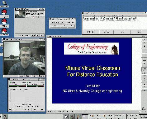The primary components of the distance education software used at NC State are the MBone tools. These are vic, rat, wbd, and sdr are available for download in binary and source form at University College London's (UCL) web site at http://www-mice.cs.ucl.ac.uk/multimedia/software/. vic is an MBone video-conferencing tool. It was originally developed by Steve McCanne and Van Jacobson at the Lawrence Berkeley National Laboratory (LBNL) Network Research Group. The version being used at NC State is currently under development at UCL. This version provides video-capture support using Video4Linux, so many existing video-capture cards are compatible with it. It incorporates a number of codecs including H.261 and H.263. It provides controls to adjust frame rate, bandwidth, and video quality, as well as many other options. Users can switch between thumbnail and full-screen video windows, and switch between a number of video formats. vic runs in multicast- conference mode or point-to-point-unicast mode.