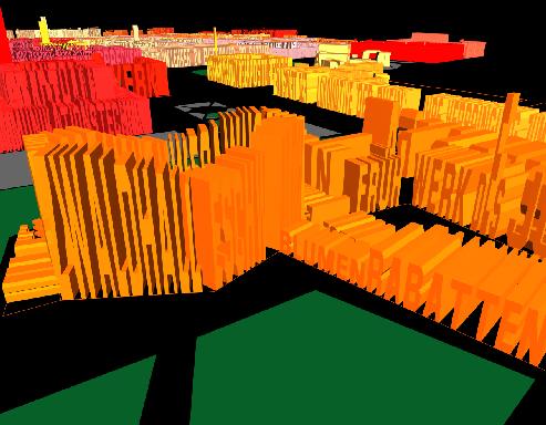 The 3-D text example is part of a real application—the “Legible City II”, a multimedia artwork by Jeffrey Shaw (ZKM Germany). It uses the above technique to render three large cities (Amsterdam, Manhattan and Karlsruhe) of words (see Figure 3). To render a more game-like environment, the application callbacks will use the more traditional games techniques to render their objects (see Figure 4).