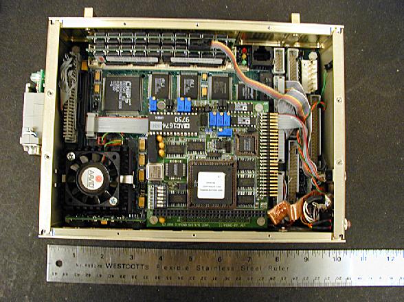 The inside of the control computer assembly, with a single board computer and stack-on PC-104 module, is pictured in Figure 11. The unit is 6 feet wide and 2.5 feet deep. Figure 12 shows the outside front of the control computer assembly with the keypad and mini-VGA attached. Analog and digital IO capabilities, necessary for interfacing to control hardware and sensors, are implemented via an additional PC-104 module. Imaging of the experiments within the payloads is accomplished via multiple cameras interfaced to a PC-104 frame-grabber. This generic hardware architecture allows for the integration of a complex array of sensors and control actuators. Additionally, distributed processing is implemented by attaching micro-controllers over a serial RS485 multi-drop communications bus, which facilitates the addition of new control hardware in a modular manner.