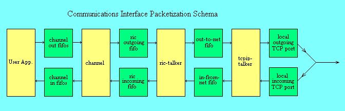The communications system is implemented in a modular manner as well. Data transmission is abstracted at the programming interface level as different messages (e.g., analog data, health and status messages, images, etc.). These different length messages are termed “channels”. A thread that wishes to transmit a message to ground stations, queues (writes) a dynamic message of pre-defined length to a specified channel (see Figure 14). The channeling system prepends channel routing information and a packet checksum. Multiple channel messages are combined into a secondary packet to maximize usage of available bandwidth. This secondary packet is termed a “RIC” packet; it serves as an interface abstraction to the Rack Interface Computer which is used onboard the International Space Station to communicate to the different payloads. RIC packet contents are also sanity checked via an additional checksum. Finally, the RIC packet is encapsulated into a TCP/IP packet for delivery to the payload.
